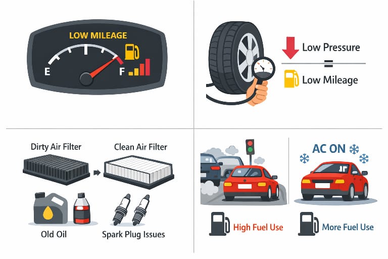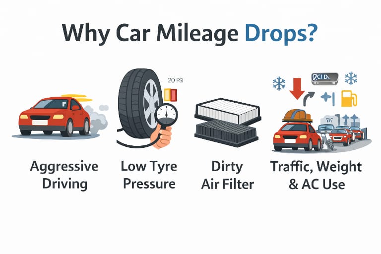 Car mileage अचानक गिरने की सबसे बड़ी वजह driving style, low tyre pressure, traffic conditions, AC overuse और delayed servicing होती है। कई बार engine में कोई बड़ी खराबी नहीं होती, लेकिन small factors मिलकर mileage को 25–30% तक reduce कर देते हैं।