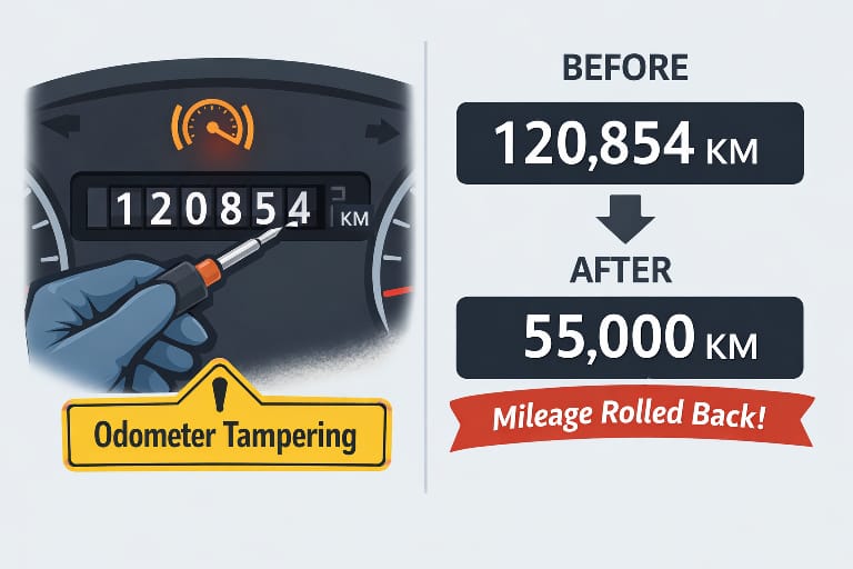 सबसे common और dangerous scam है odometer rollback। Dealer कार की actual running कम दिखाने के लिए मीटर से छेड़छाड़ करता है। मान लो car 1,20,000 km चली हुई है, लेकिन meter पर दिखाया जाएगा सिर्फ 55,000 km। Buyer सोचता है कि कम चली हुई car है, engine fresh होगा, maintenance कम लगेगा, और इसी सोच में वो ज्यादा पैसे दे देता है।